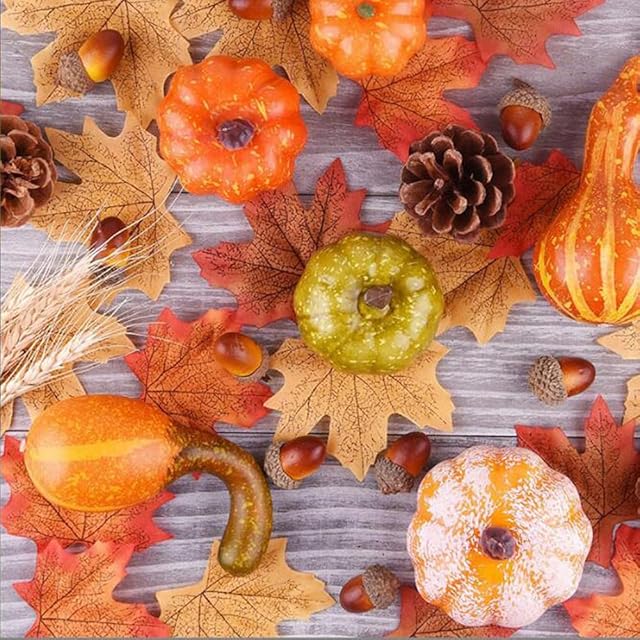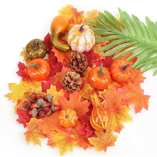 【豪華なセット内容】50個のアイテムが含まれています。ミニカボチャ8個、どんぐり(スタイルランダム)10個、松ぼっくり2個、紅葉(ブレンドカラー)30個の組み合わせセットに、PVC製の3D立体コウモリウォールステッカー12個が付いています。