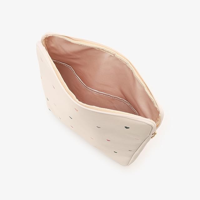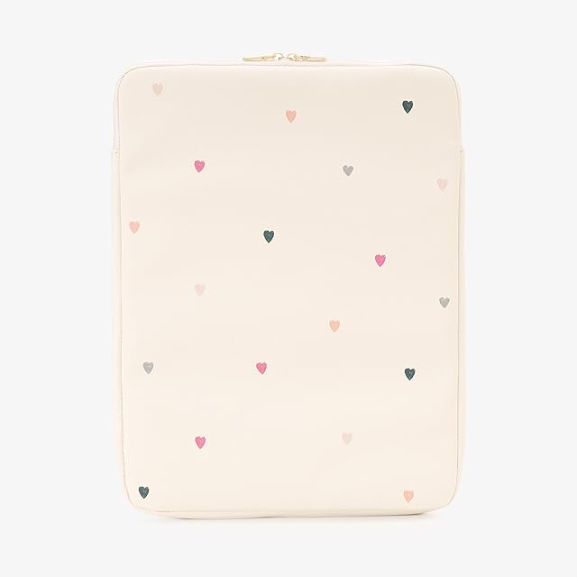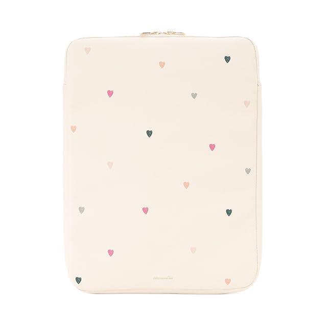 カラフルなハート柄をあしらったPCケースです。<br/>モチーフを小さめにデザインし、落ち着いた色合いにすることで、甘くなりすぎない上品な見た目に仕上げました。箔押しのロゴがさりげないアクセントになっています。 大きく開くダブルファスナー仕様で、スムーズな出し入れが可能。14インチまでのPCを収納でき、内ポケット付きなのでペンやメモなども一緒に持ち歩くことができます。オフィスや学校用など、さまざまなシーンで活躍してくれそうですね。ご自宅用にはもちろん、これから新生活を迎える方へのプレゼントにもいかがでしょうか。