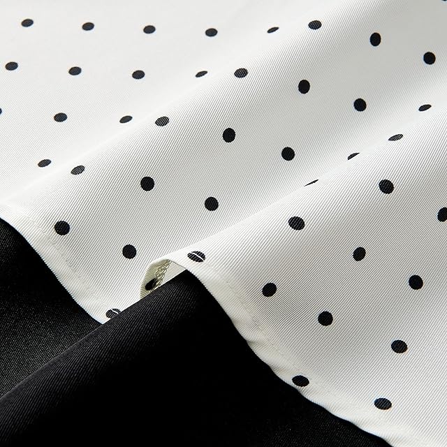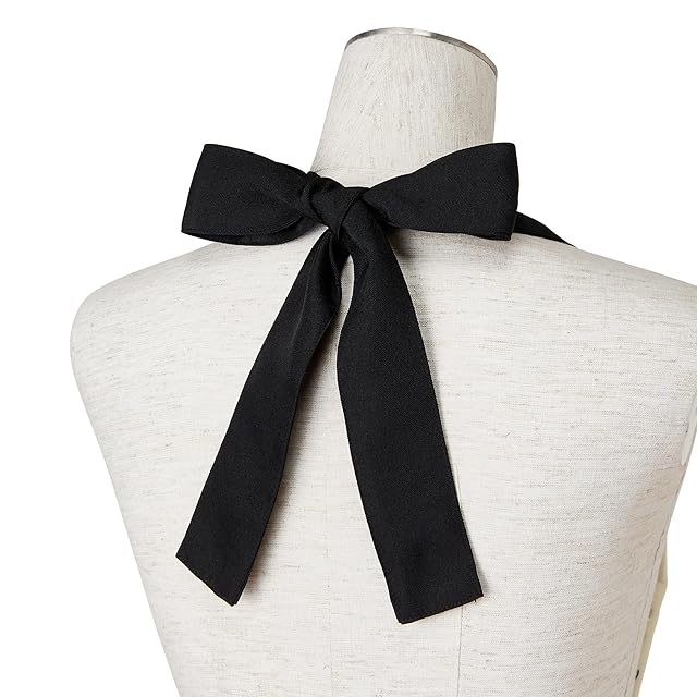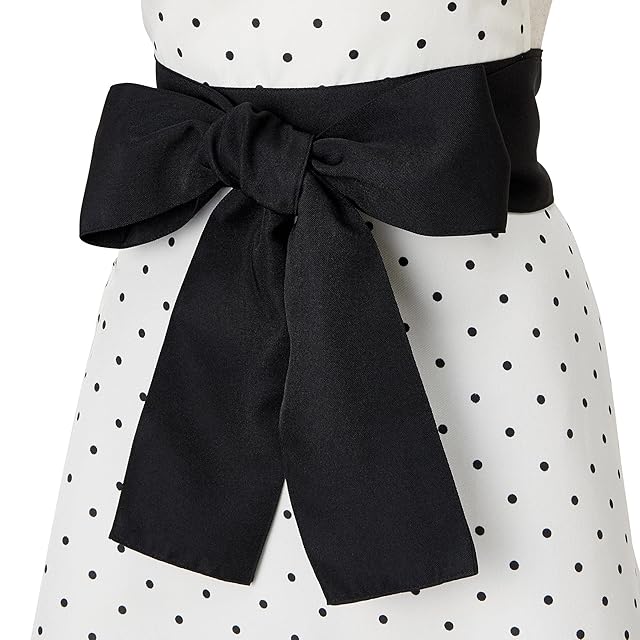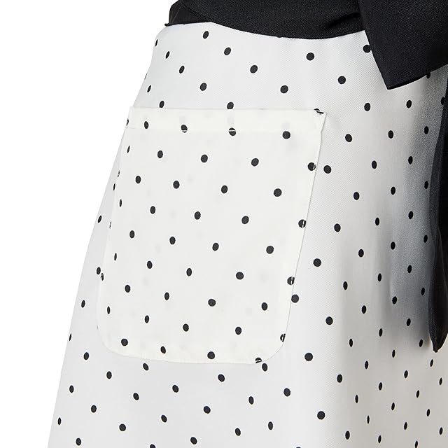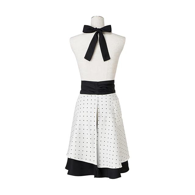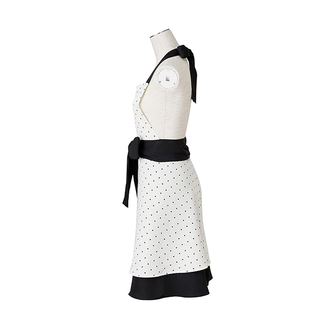 アイボリー生地に細かいドット柄を合わせたスイートなエプロンです。<br>甘くなりすぎず着やすい柄に仕上げました。<br>2枚重ねのスカートようなボリュームのあるデザイン。<br>大きめの腰紐リボンはスタイルが良くみえ、首の後ろで結ぶリボンも大きく立体感があるのでバックスタイルも可愛く見せてくれます。<br>ポリエステル生地でシワになりにくいのが特徴です。<br>ポケットにはキッチン用品や携帯電話などを入れることができて機能性もバッチリです。
