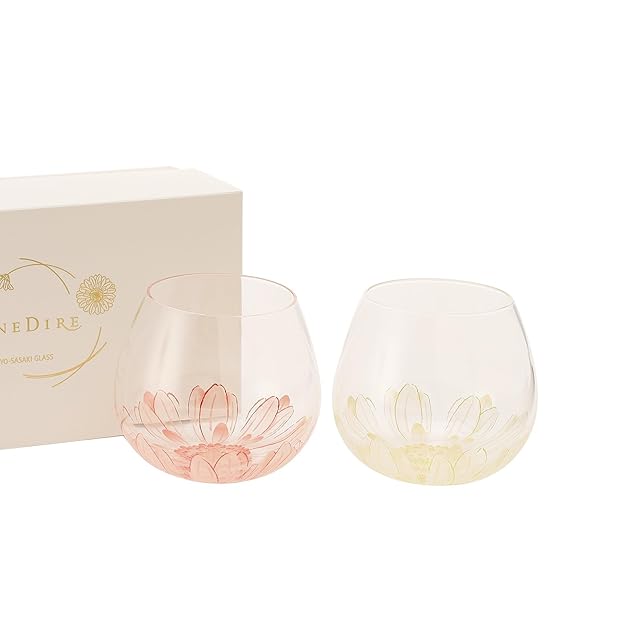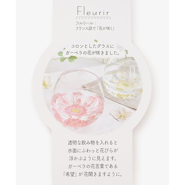 底部分に美しいガーベラの花をデザインした、ゆらゆらと揺れるグラスのペアセットです。<br/>ガーベラの花言葉は「希望」。フルリールとは、フランス語で「花が咲く」を意味します。ころんとしたかわいらしい形状のグラスに透明な飲み物を入れると、その名の通り水面にふわっと花びらが浮かぶように見えるのが魅力。思わず眺めていたくなるデザインで、お世話になった方へ贈るギフトや結婚祝いなどにもおすすめです。2色セットになっているため、大切な人とペア使いしたり、シーンによって使い分けたりと、あなた好みの使い方を選んでくださいね。