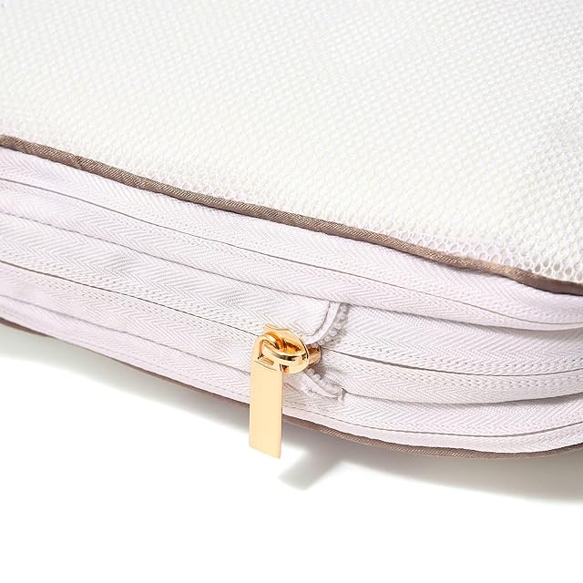 かさばる衣類を収納し、ファスナーを閉めるだけで簡単に圧縮できるオーガナイザーです。 外側についているファスナーをぐるっと1周半閉じると衣類が圧縮されます。