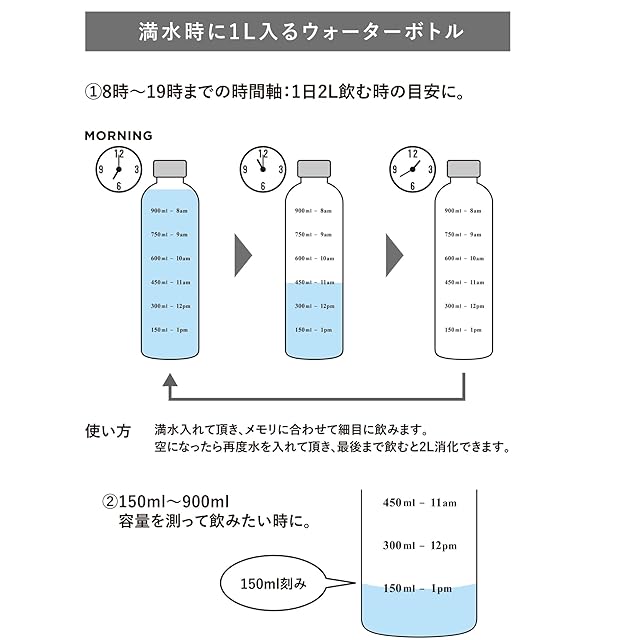 使い方①8時〜19時までの時間軸で飲みたい方:・ボトル一杯にお水を入れ、メモリに合わせてこまめに飲みます。・空になったら再度お水を入れ、同じようにこまめに飲みます。・ボトル2本分すべて飲み終えると2Lになります。 ※体質、体調により個人差がございますが、1日2L以上、こまめに常温水を飲むと美容に良いと言われています。