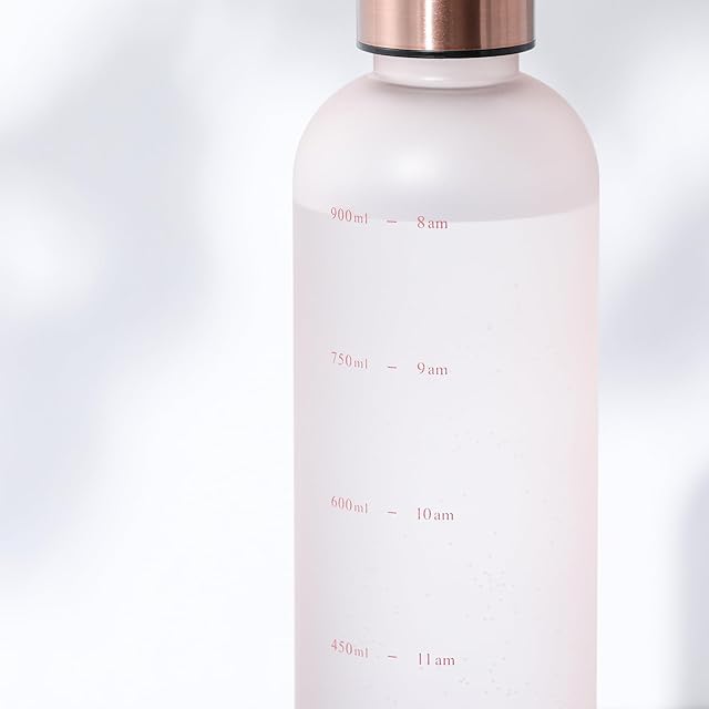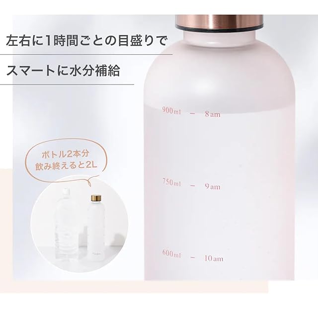 目盛りと一緒に「時間」が書かれている便利なウォーターボトルです。 デスクやフィットネスなど、様々な場面で活躍します。 健康の為に大切な水分補給も、時間が書いてあることで飲み忘れを防げます。 <使い方> ①8時〜19時までの時間軸で飲みたい方 ・ボトル一杯にお水を入れ、メモリに合わせてこまめに飲みます。 ・空になったら再度お水を入れ、同じようにこまめに飲みます。 ・ボトル2本分すべて飲み終えると2Lになります。 ※体質、体調により個人差がございますが、1日2L以上、こまめに常温水を飲むと美容に良いと言われています。 ②容量を測って飲みたい方 ・150mlごとのメモリなので、好みの容量で区切って飲むことができます。 ・900mlまで測れるのでたっぷり飲みたいときも便利です。 カラーは、ピンク・ホワイト・グリーンの3色をご用意しました。お気に入りのカラーで健康習慣を始めてみてはいかがでしょうか。