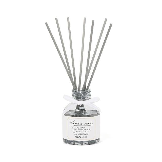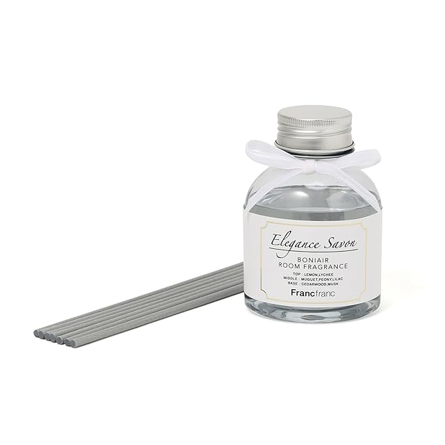 清潔なイメージの白をベースにしたエレガントなデザインのディフューザーです。<br/>香りは、人気のホワイトサボンをベースとした少し大人っぽい香りで消臭効果もあります。<br/>【使用方法】<br/>シルバーキャップを開け、付属のスティックを数本ずつ、ゆっくりと挿入してください。一度に挿すと液がこぼれることがございますので、スティックに液を染み込ませながら、少しずつ様子を見ながら挿入ください。<br/>使用するスティックの本数によって香りの調節ができます。※芳香が強い場合はスティックの本数を減らしてください。<br/>受け皿などを使用し、壁面から離してご使用ください。<br/>※全ての生活臭に効果があるものではありません。予めご了承ください。<br/>エレガンスサボンの香り<br/>トップ:レモン/ライチ<br/>ミドル:ミュゲ/ピオニー/ライラック<br/>ベース:シダーウッド/ムスク<br/>【注意事項】<br/>お子様やペットの手の届かないところで使用、保管してください。<br/>平らな場所で使用、保管してください。<br/>高温、直射日光、火気を避けて使用、保管してください。<br/>本来の使用目的以外の使用はお避けください。<br/>使用や保管状況により液体に濁りや沈殿物が生じたり、稀に変色することがありますが、品質には問題ありません。<br/>家具や壁面等を傷める恐れがありますので、ご使用の際は必ずコースターやトレーをお使いください。スティックが落ちたり液体がこぼれた場合は、すぐに拭き取ってください。<br/>※消臭効果は使用環境により異なります。<br/>原産国:中国