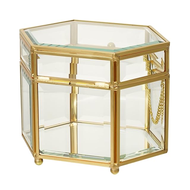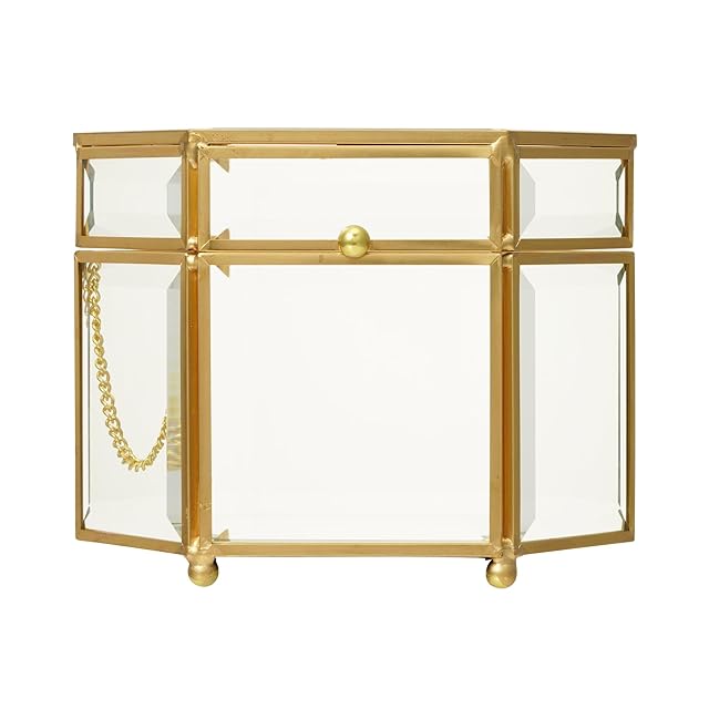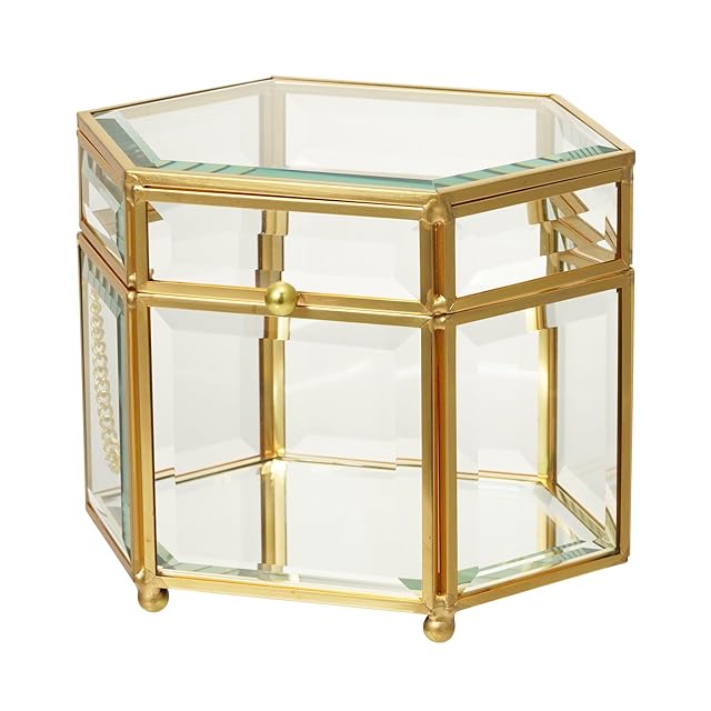 ゴールドのメタルフレームが高級感あふれる、上品なデザインの小物入れです。<br>シンプルでありつつ、ガラスとミラーの輝きが素敵なアイテムです。<br>ジュエリーケースとしてはもちろん、ポプリや香水をいれて飾るのもおすすめです。