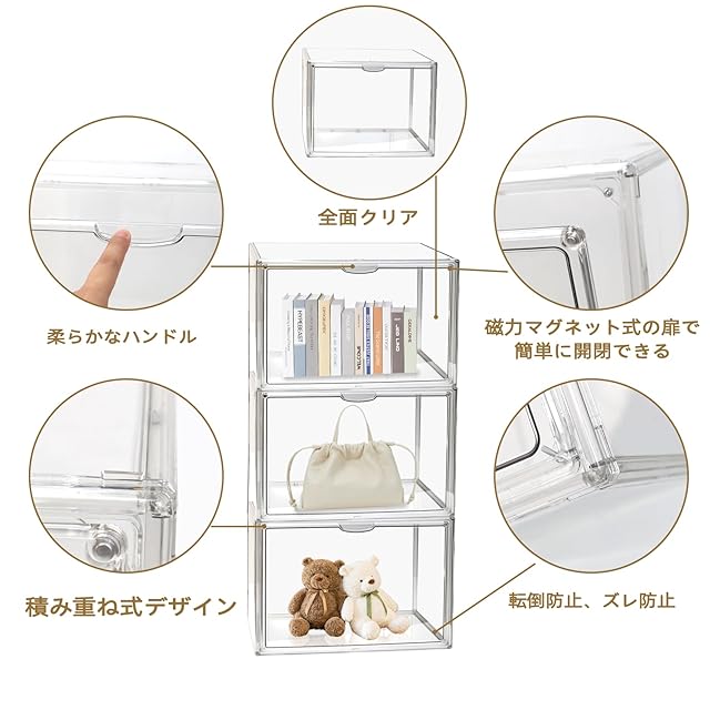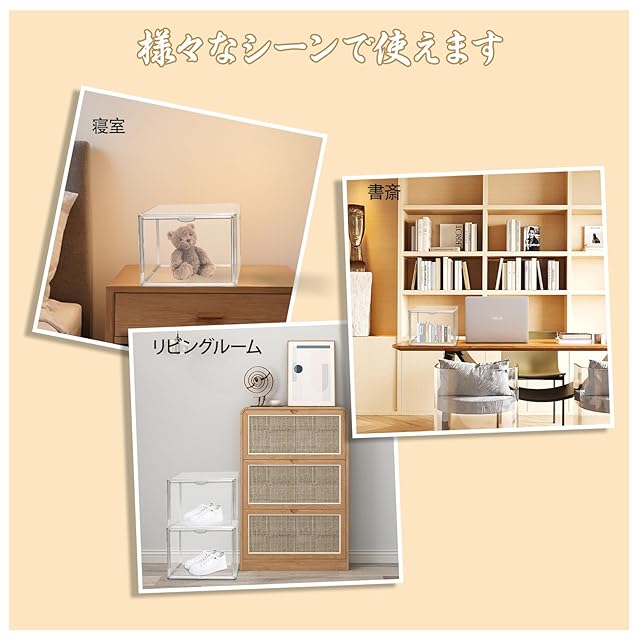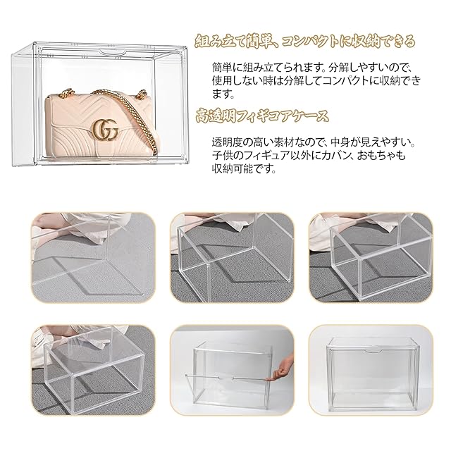 【多機能】収納ボックスとして、本、おもちゃ、フィギュア、靴、カバン、アクセサリー、化粧品、雑貨、趣味の品などが収納できます。防塵性があり、ほこりや汚れから大切な展示品を守ります。汚れた場合は、ティッシュや布で優しく拭いてください。