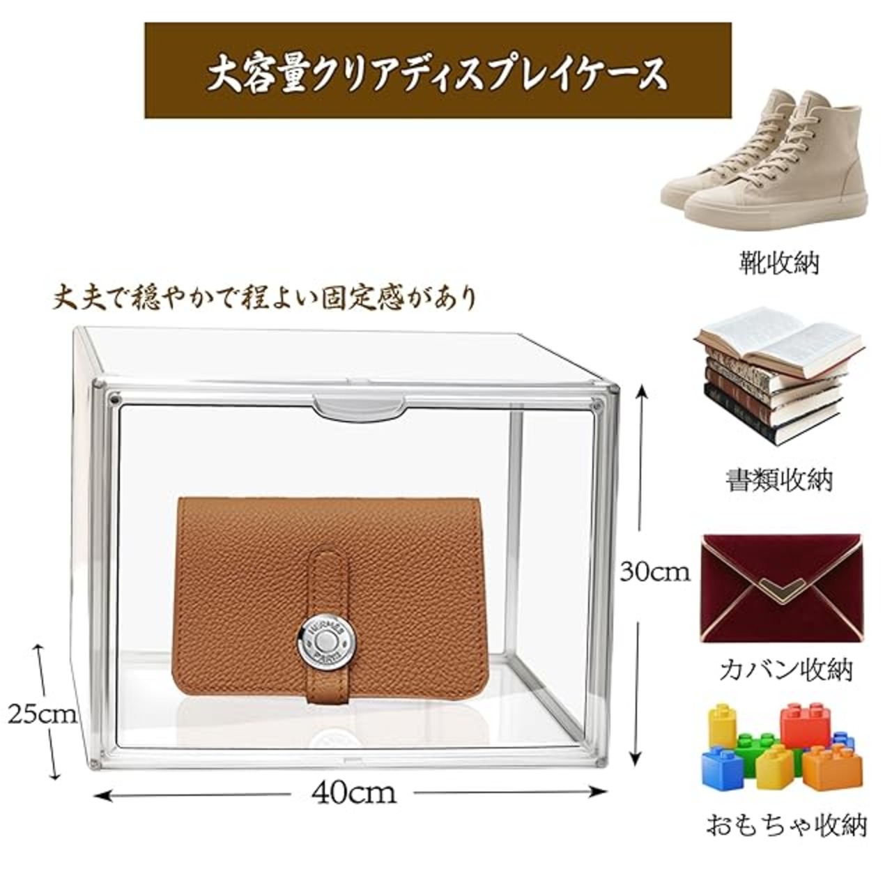 【大容量】大容量透明コレクションケース、縦置き、横置き両方可能です。幅40×奥25×高さ30cmの大容量で、お気に入りのフィギュア、カバン、雑貨、帽子、スニーカー、本、おもちゃ、化粧品、小物入れの陳列棚として扱れます。