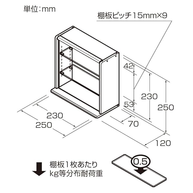 棚板ピッチ:15mmx9、棚板1枚あたりkg等分布耐荷重:0.5