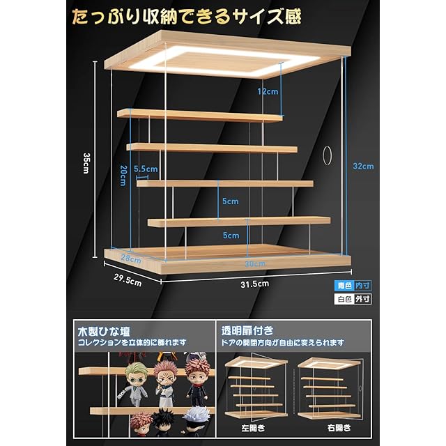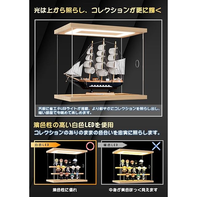 【明るく照らすLEDライト】天井板に長方形LEDライトが付いております。上から光が当たり、ケース内を更に明るく。置き場所に困らないUSB電源仕様、スイッチでON/OFFの切り替えが可能。演色性の高い昼白色LEDを使用し、コレクションの自然な色を再現します。