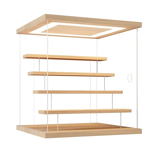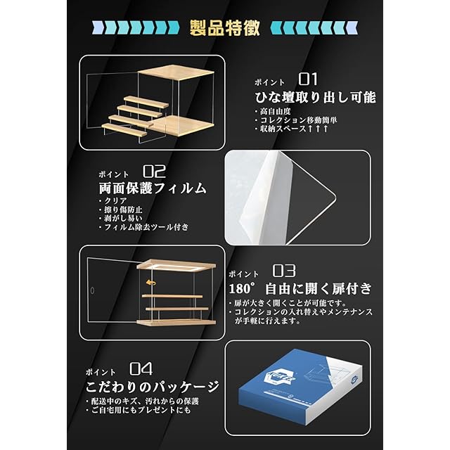 【見栄えアップ】厚み2.5mmの高透明UVカットアクリル素材を使用、コレクションをアクリル越しでもキレイに魅せます。ガラスに匹敵する95%以上の高透過率を兼ね備えながら軽量で割れにくいです。木材で作り上げた天板・台座・ひな壇は高級感を演出、ナチュラル感たっぷりです。