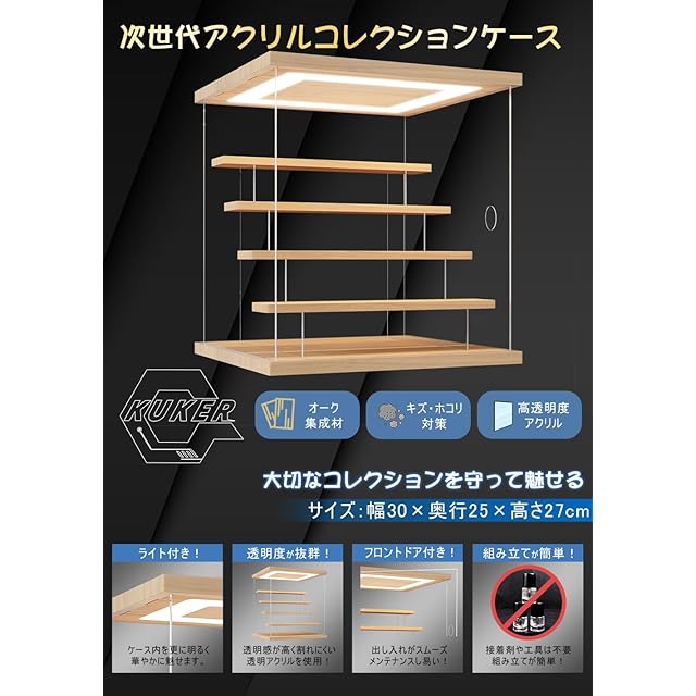 KUKERフィギュアケース コレクションケース アクリルケース LED照明付き ディスプレイケース ショーケース クリアケース 展示ケース ひな壇 扉付き 木製 組み立て簡単 手袋 防汚れ クリーニングクロス付き(LEDホワイト・ひな壇4段・30×28×32cm)