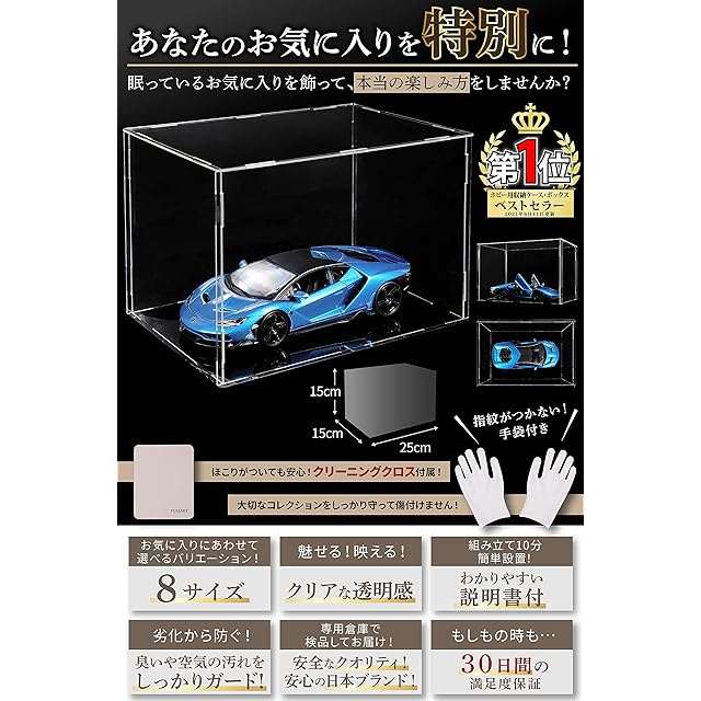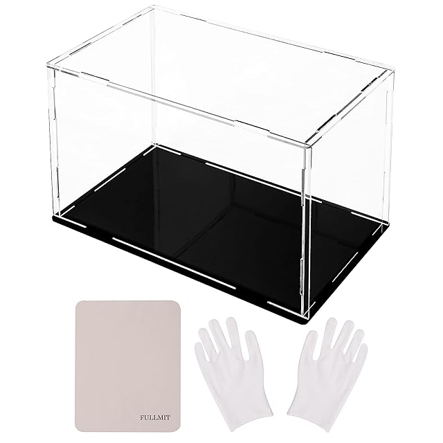 【選べるサイズ】フルミット フィギュアケース アクリル コレクションケース 高透明度 【UVカット】 透明収納ケース 組み立て 簡単 防汚れ 手袋 クリーニング クロス付き お手入れ方法 説明書 (縦25 x 横15 x 高15cm)