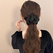 直径約15cm、幅約7cm。密度の高いギャザーなら無造作ヘアも華エレガントに仕上がる。光沢のあるシュシュが、優しく女性らしい印象に。
