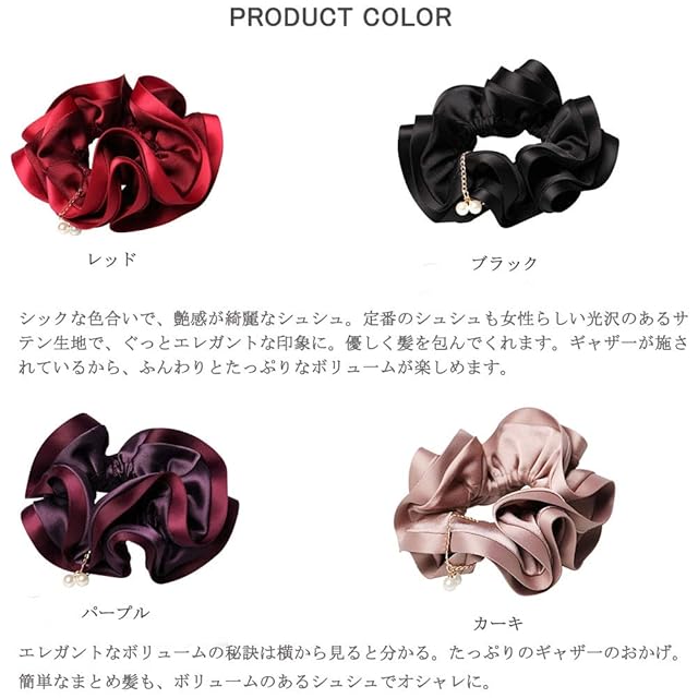 【上品】シックな色合いで艶感が綺麗な印象。定番のシュシュも女性らしい光沢のあるサテン生地で、ぐっとエレガントな印象に。