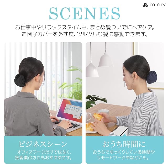 【ご利用シーン】お仕事中やリラックスタイム中、まとめ髪ついでにヘアケア。お団子カバーを外す度、ツルツルな髪に感動できます。《ビジネスシーン》オフィスワークだけではなく、接客業の方にもおすすめです。《おうち時間に》おうちでゆっくりしている時間やリモートワーク中などにも。