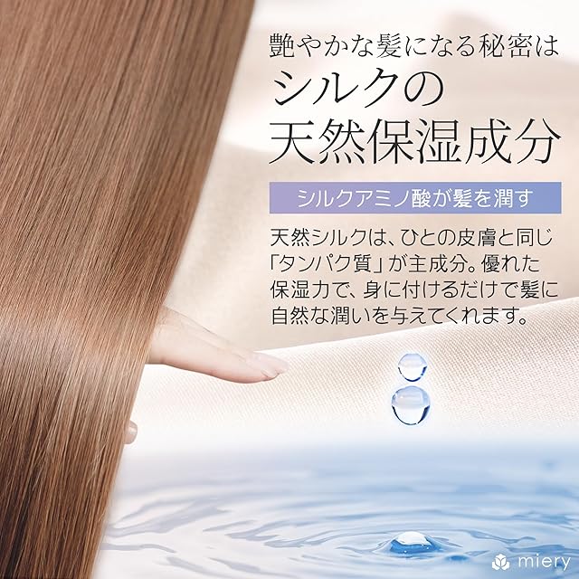 【天然シルク100%使用】天然シルクは、ひとの皮膚と同じ「タンパク質」が主成分。優れた保湿力で、身に付けるだけで髪に自然な潤いを与えてくれます。当製品は最高品質の6Aランク天然シルクを100%使用。
