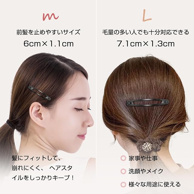 【MサイズとLサイズの選択】M サイズは前髪を止めやすいサイズで、 L サイズは毛量の多い人でも十分対応できると思います、 毛量は標準ぐらいですが 、使う部位により M サイズ と L サイズを使い分けし重宝しています。