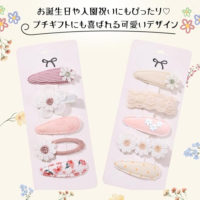 【商品ポイント】 可愛い花柄デザインをお子様に! ピンクと白をベースにした存在感のあるお花モチーフが、お子様の髪を華やかに♪ 10個セットで使い分け自由♪ ヘアアレンジやコーディネートに合わせて選べるセットタイプ。 毎日違うデザインを楽しめます! 簡単に使えるクリップ式 お子様でも自分で付けやすいから、毎日のヘアセットも楽しくお手伝い♪ ギフトにもおすすめ! 入園祝い、誕生日プレゼント、お友達へのプチギフトにも♪