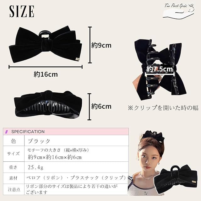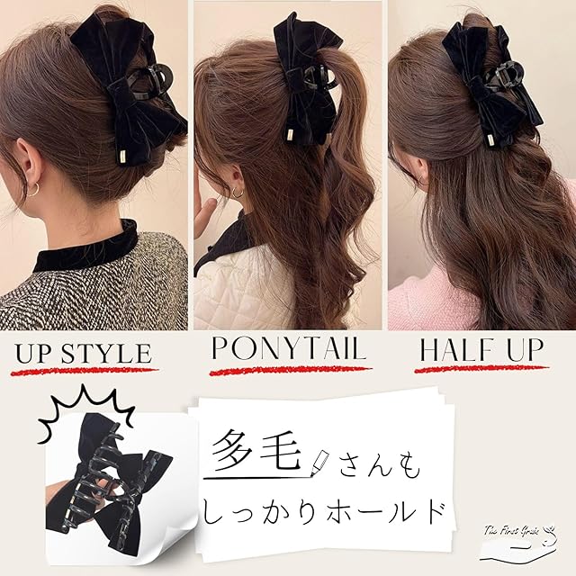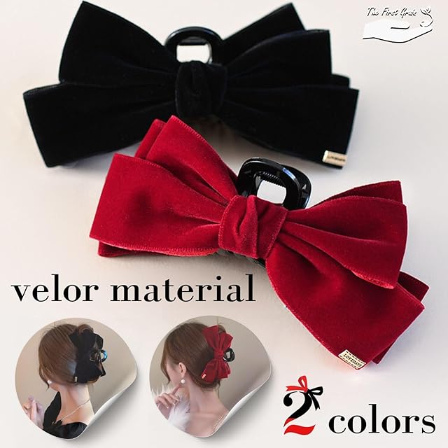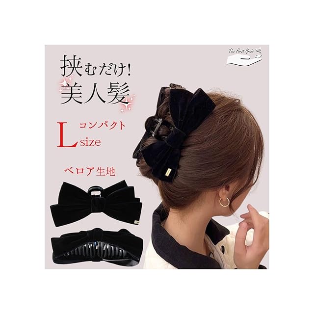 商品名:TheFirstGrain バンスクリップ リボン ヘアクリップ 大きめ 髪留め クリップ ベロア (ブラック)