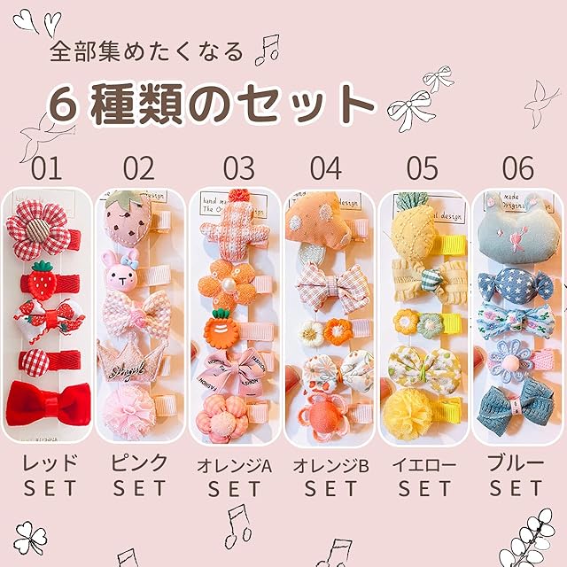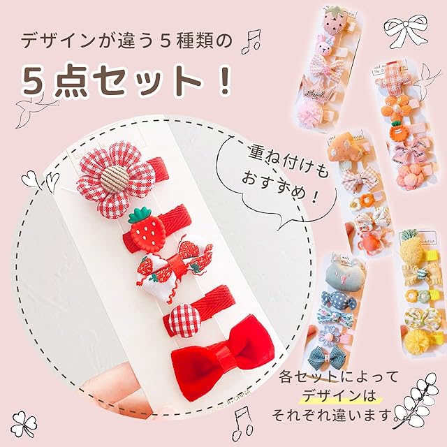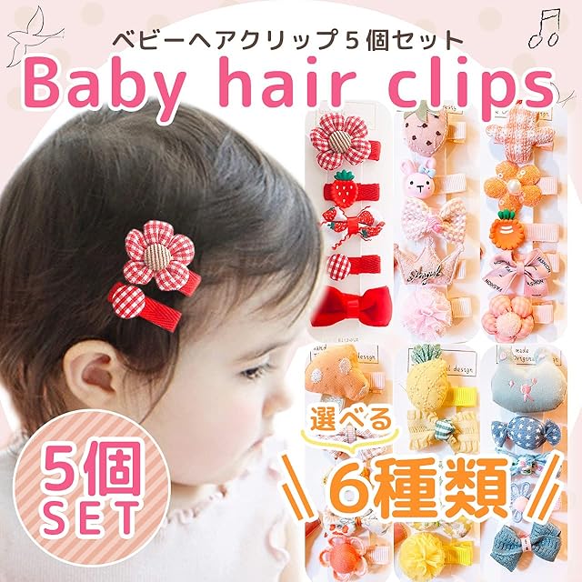 ヘアクリップの5点セット。赤ちゃんから使用できるようにクリップ部分を布で覆われています。