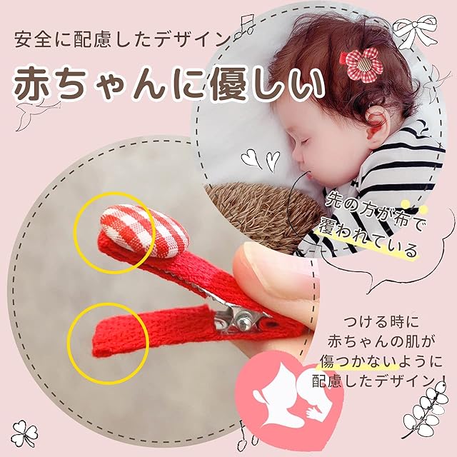 【ポイント】赤ちゃんの肌が傷つかいないように、金具部分が布で覆われたヘアクリップ。
