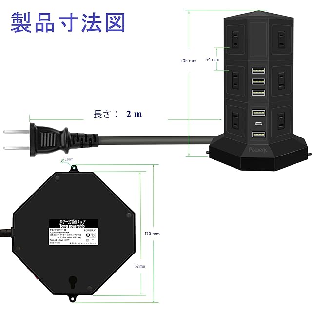 ■1,商品名; 1500wタワ電源タップusb付き<br> ■2,入力電圧; AC90-125V 50/60Hz 15A<br> ■3,Type-C USB出力電圧: 5V 3A,9V 1.5A, 12V 1.5A。 ■4,USB出力電圧; DC5V 2.4A x 5<br> ■5,AC電力出力; 1500W以下<br> ■6,定格周波数; 50/60Hz<br> ■7,防火ランク; 94V0 <br> ■8,材質:本体:ABS+PC樹脂、プラグ:PVC 差込口:ユリア樹脂<br> ■9,過負荷保護装置;1500w以下<br> ■10,商品サイズ; 約 高さ23 × 長さ14.1 ×幅14.1 CM<br> ■11,商品重量; 約650g<br> ■12,ケーブル長; 約2m<br>