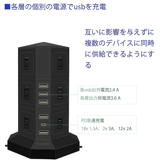 商品名:電源タップ 縦型コンセント タワー式 オフィス 会議用 USB PD Type-C付 急速充電 約2m スイッチ付 12口 3層 黒