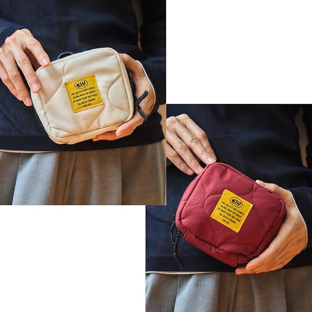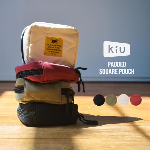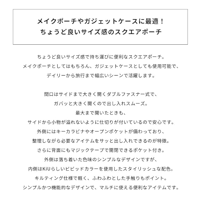 【メイクポーチやガジェットケースに最適!ちょうど良いサイズ感のスクエアポーチ】 ちょうど良いサイズ感で持ち運びに便利なスクエアポーチ。メイクポーチとしてはもちろん、ガジェットケースとしても使用可能で、デイリーから旅行まで幅広いシーンで活躍します。 間口はサイドまで大きく開くダブルファスナー式で、ガバッと大きく開くので出し入れスムーズ。 最大まで開いたときも、サイドから小物が溢れないように仕切りが付いているので安心です。 外側にはキーカラビナやオープンポケットが備わっており、整理しながら必要なアイテムをサッと出し入れできるのが特徴。 さらに背面にもマジックテープで開閉できるポケット付き。 外側は落ち着いた色味のシンプルなデザインですが、内側はKiUらしいビビッドカラーを使用したスタイリッシュな配色。 キルティング仕様で軽く、ふわふわとした手触りもポイント。 シンプルかつ機能的なデザインで、マルチに使える便利なアイテムです。