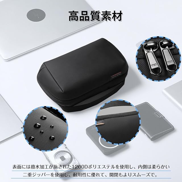 【高品質素材】表面には撥水加工が施された1200Dポリエステルを使用し、内側は柔らかいライクラ素材で構成されています。これにより、デバイスを液体から守るとともに、衝撃、ほこり、擦り傷からもしっかり保護します。二重ジッパーを使用し、耐用性に優れて、開閉もよりスムーズで。