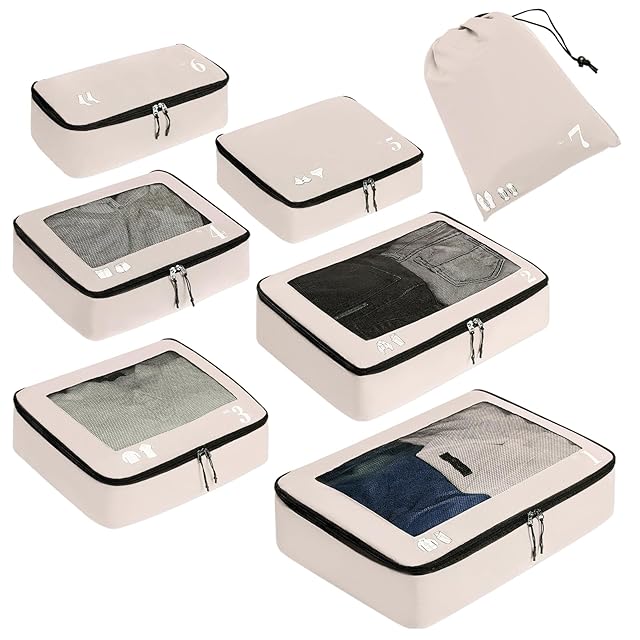 【7 ピース省スペース旅行用パッキングキューブセット】:このセットには、上にメッシュ部分があり、視認性と通気性に優れた No.1 と No.2 の大型スーツケース用整理バッグ、通気性のあるメッシュを備えたシャツ用の No.3 と No.4 の旅行用パッキングキューブ、No.5 の収納バッグは下着用バッグ、No.6 の靴下や汚れた洗濯物用の整理バッグ、No.7 のシューズ用引き紐付きバッグで、ローファーやスリッパを収納できます。さまざまなサイズの組み合わせにより、あなたのすべての身の回りの品をうまく整理するためのたくさんの選択肢を提供します。
