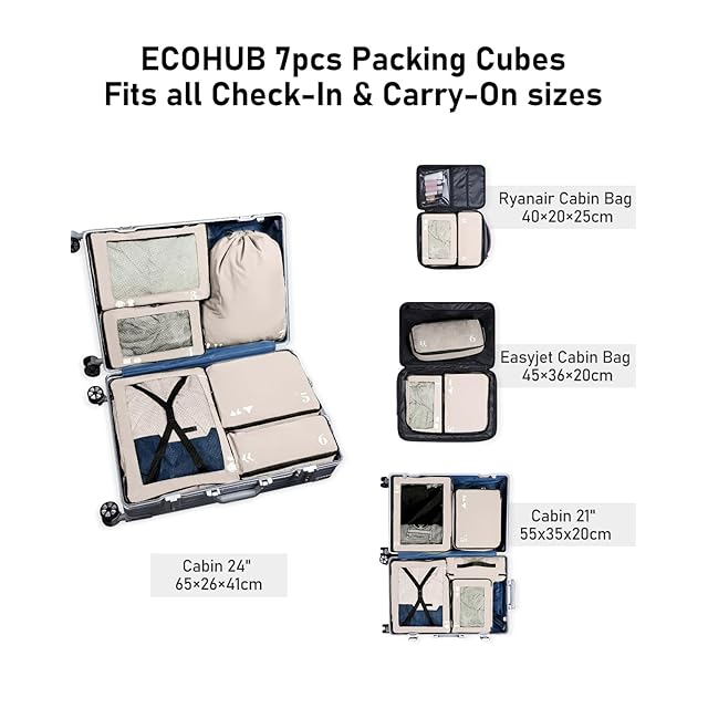 【旅行と自宅収納に最適】:7 点セットのパッキングキューブセットは、持ち込み用スーツケース、バックパック、ダッフルバッグ、トートバッグ、旅行用バッグ、ウィークエンダーバッグおよびダッフルバッグに最適です。出張旅行、家族旅行、休暇旅行、キャンプやハイキングに理想的です。ECOHUB のパッキングバッグは航空旅行に必須のアイテムであり、同時に自宅でのシーズン外れの衣類の収納にも上品な方法となります。