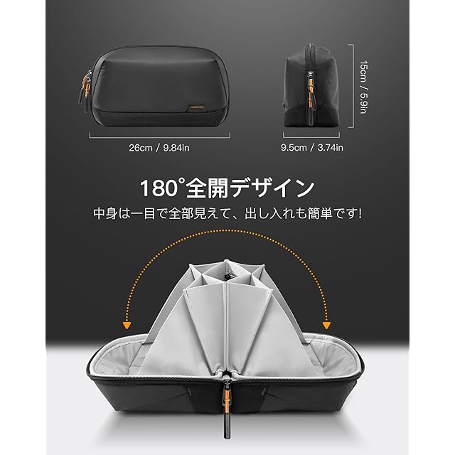 Inateck ガジェットポーチ 超強収納力 180°開口デザイントラベル大容量 マルチポケット PC周辺小物用収納撥水 高耐久 万能ケース 5層仕組みバッグ 出張 便利グッズ ブラック