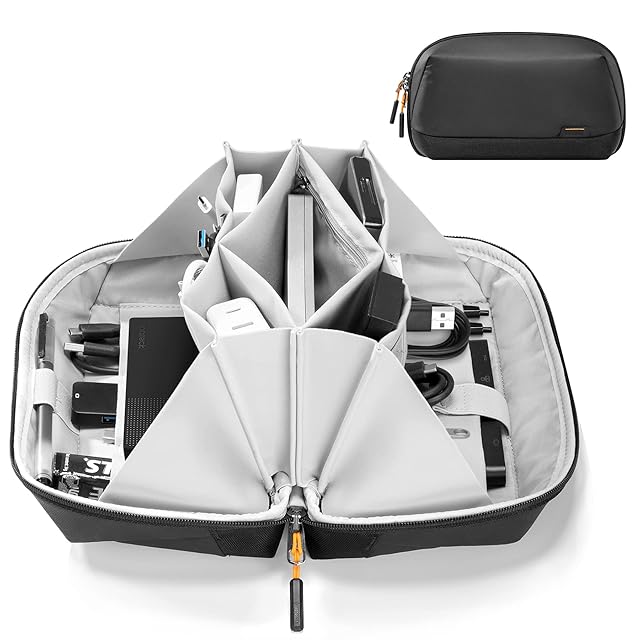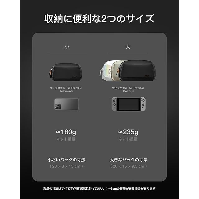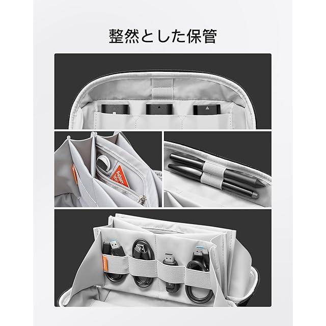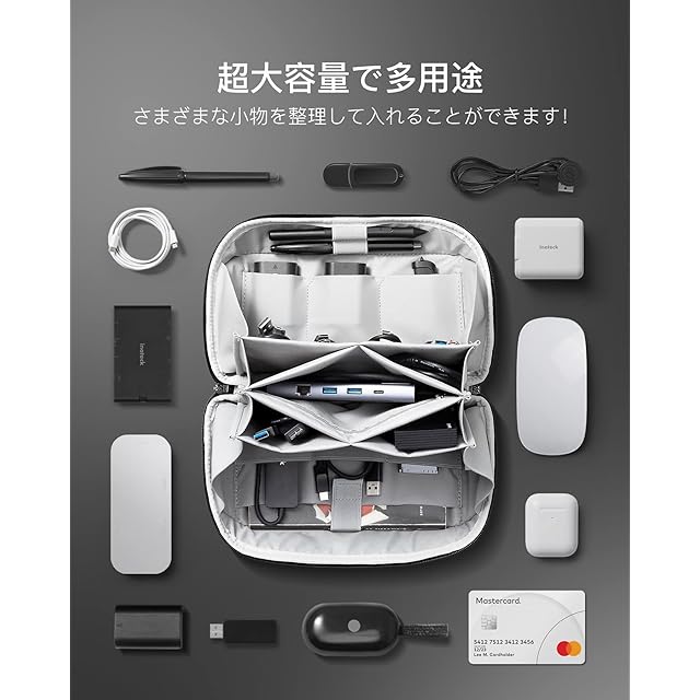 整然とした保管:充電器、ハードドライブ、モバイルバッテリー、マウス、イヤホン、USBケーブル、ノートブック、ゲームカード、ペンなどを保管すできる様々なサイズのコンパートメントまたはポケットが12個あります。物の大きさごとに分類を行うことで整然としているポーチを作ることができます。