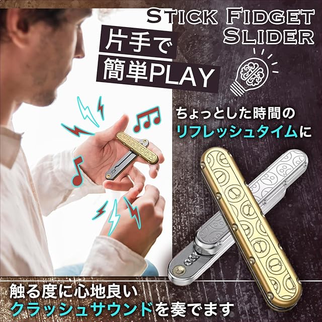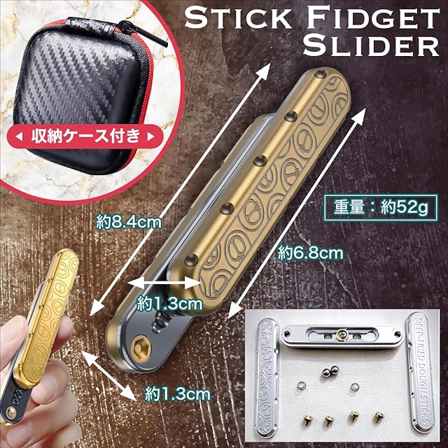<br><br>【場所を選ばず使える安心設計で収納ケース付き】 本セットはストレージケースが付属しているため、手軽に持ち運びができ、紛失や傷などの心配もなく安心です。軽量型でコンパクトなため、片手でも簡単に操作でき、仕事や勉強の合間の気分転換にぴったりです。ストレスや不安を感じたときにも、静かに素早く心を落ち着けることができる、頼れるリラクゼーショングッズです。<br><br>【コンパクト設計で持ち運びに最適】 スティック型の細長シルエットは、手のひらにすっぽり収まるサイズで、ズボンや上着のポケットにも簡単に収納可能。約52gと重さも非常に軽量なため、バッグやポーチに入れてもかさばらず、外出先でもストレスなく持ち運べます。毎日の通勤・通学のお供として、どこでも手軽にフィジェット体験ができ、忙しい日常の中でもリラックス時間を作れます。<br><br>【集中力アップや習慣改善にも効果的】 指先を使った一定のリズム動作は、リラックス効果だけでなく集中力の向上にも役立ちます。仕事や勉強中の小休憩、アイデア出しのブレイクタイムに取り入れれば、スムーズな操作性と適度な金属音によって、集中力の向上を狙えます。さらに禁煙や爪噛み、スマホ依存など、悪習慣の置き換えアイテムとしても注目されている便利なツールです。<br><br>【高級感ある見た目でプレゼントにも◎】 メタリックな質感と重厚感のある仕上がりは、高級感があり所有欲を満たしてくれます。インテリアとしても映えるスタイリッシュなデザインで、性別や年齢を問わずギフトとしても喜ばれます。収納ケースも付いているため、誕生日や記念日、父の日への贈り物、ビジネスギフトとしてもおすすめです。ちょっと特別な癒しアイテムを贈りたい方にぴったりです。<br><br>【滑らかな操作性でクセになる感覚】 滑らかな操作性で、繰り返し操作しても引っかかることがなく、快適な使い心地が続きます。360度の回転と上へのスライドに対応しており、指先の赴くままに自由に動かせる設計です。手持無沙汰なときや、つい出てしまう癖の対策にも最適なアイテムです。【セット内容】Stick Fidget Slider×1、収納ケース×1【商品仕様】サイズ:約6.8㎝×1.3㎝、重量:約52g※対象年齢6歳以上<br><br>