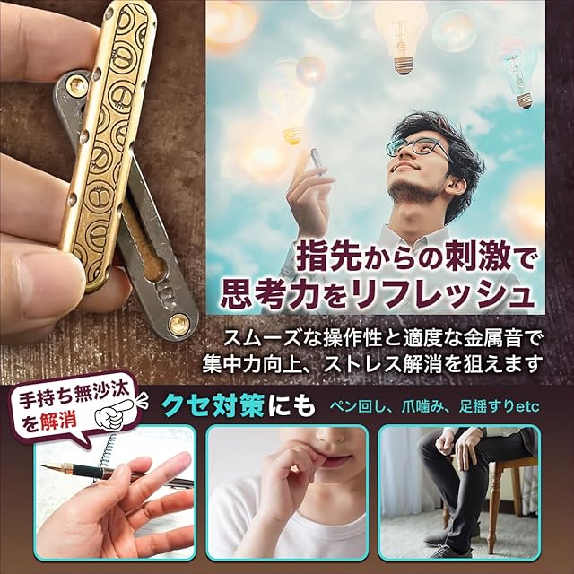 【集中力アップや習慣改善にも効果的】 指先を使った一定のリズム動作は、リラックス効果だけでなく集中力の向上にも役立ちます。仕事や勉強中の小休憩、アイデア出しのブレイクタイムに取り入れれば、スムーズな操作性と適度な金属音によって、集中力の向上を狙えます。さらに禁煙や爪噛み、スマホ依存など、悪習慣の置き換えアイテムとしても注目されている便利なツールです。
