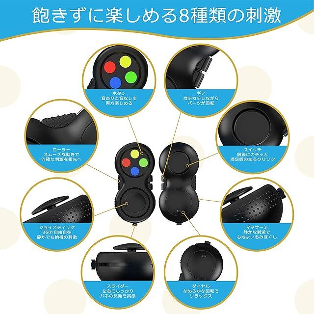 多様なフィジェット機能: このフィジェットトイには、回転式ジョイスティック、クリック音とクリック音の両方が聞こえる4つのボタン、ギアローラー、グリップテクスチャマッサージローラー、クリック可能なスイッチ、回転可能なダイヤル、バネ式スライダー、グリップテクスチャセクションなど、8種類のフィジェット機能があり、さまざまな触感を体験できます。