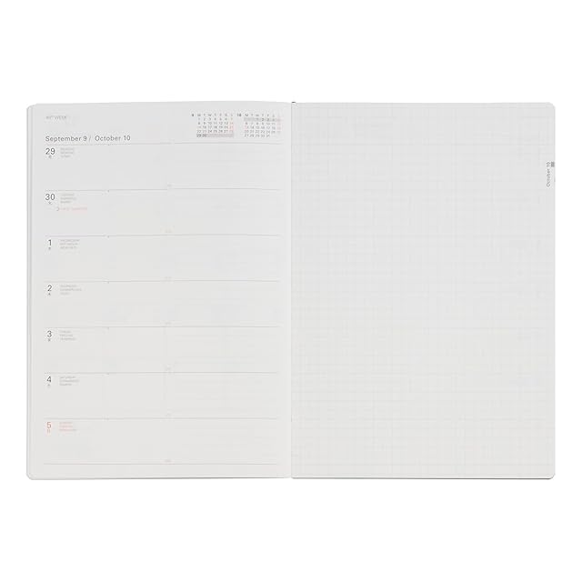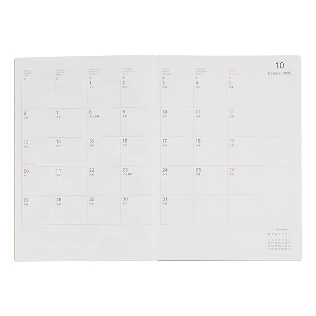 2025年10月~2026年12月までのスケジュールを管理できる、書き込みにゆとりのあるB6サイズのダイアリーリフィルです。</br></br> 中面は、見開き1ヶ月のマンスリーと、見開き1週間のウィークリーで構成。ウィークリーページは、左ページが週間スケジュール、右ページが方眼メモになったホリゾンタルタイプ。</br>マンスリーページは、6段のカレンダーで、6週になる月の最終週も予定がしっかり書き込めます。ホリゾンタルタイプのウィークリーページは、予定とタスク管理を見開きの左ページに集約できます。</br>1日の左半分を日付入りのフリースペース、右半分を罫線メモスペースに分け、To Doや文章の記入しやすくなっています。見開きの右ページメモは自由度の高い方眼。予定と記録が見渡せて、より書き込みがしやすいレイアウトです。</br>巻末には自由に使える方眼メモも22ページあります。2本のスピン(しおり紐)付きで、マンスリーとウィークリーの区別に役立ちます。祝日や、大安や仏滅といった六曜も記載された、見やすく機能的なデザインです。</br></br> 巻末の付録には、年齢早見表、単位換算表やmm表記の目盛り線などの役立つ情報を掲載。世界地図、日本地図、日本の8都市の地下鉄路線図に加え、デルフォニックスの直営店があるパリのメトロマップも収載しています。</br></br> ※「ウィークリー ホリゾンタル」は、2024年版以前に販売していた「ウィークリー タイプB」です。