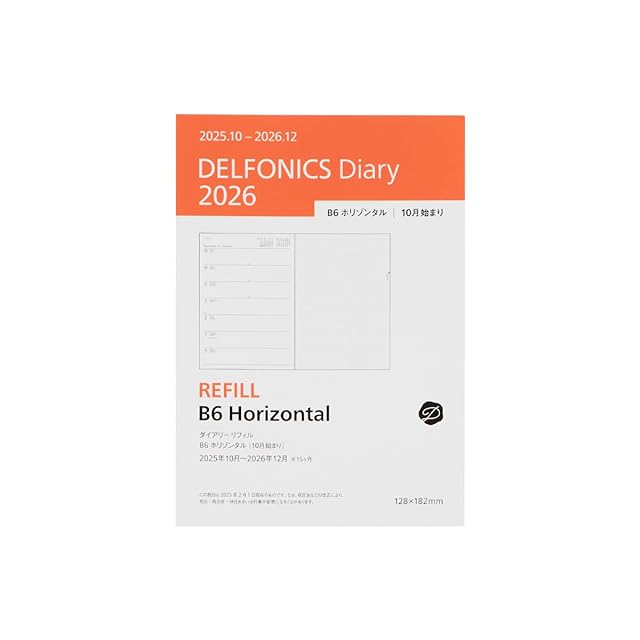 【デルフォニックス手帳 2026年版/2025年10月始まり】ダイアリーリフィル B6 ホリゾンタル スケジュール帳 ウィークリー