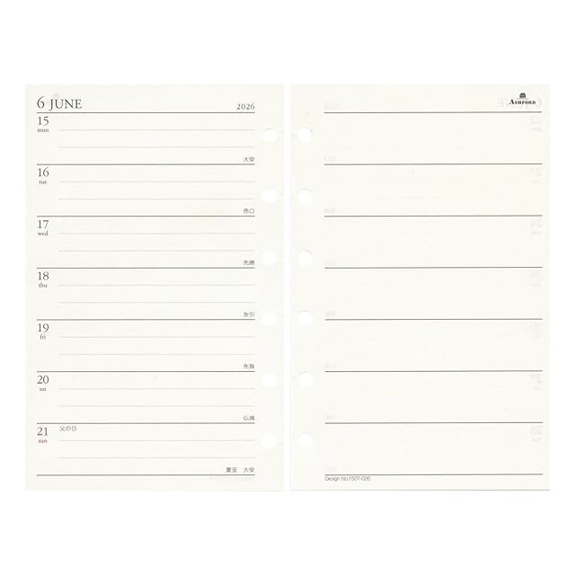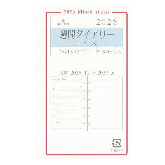 2026年 ミニ6穴サイズ グレース 週間ダイアリー レフト式 システム手帳リフィル 1507-02