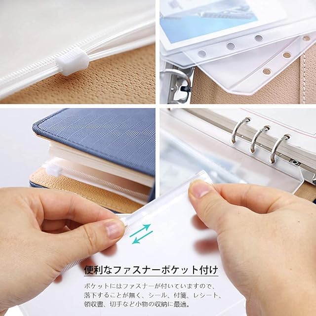 便利なファスナーポケット A5サイズ ファスナーには便利な引手付き、付箋、シール、レシート、領収書、クリップ等小物の収納に便利なポケットリフィル。耐久性のある素材を使用し、穴の部分が補強されているので、丈夫で耐久性が高いです。