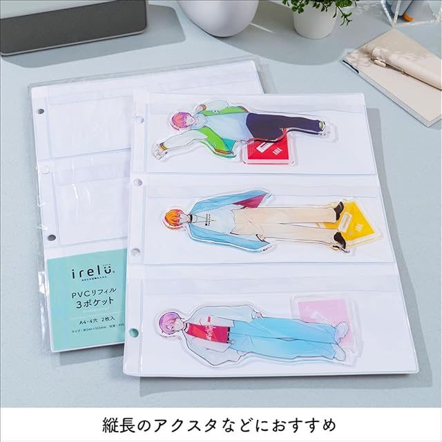 商品名:【irelu】 縦長のアクスタ収納 [イレールPVCリフィル 3ポケット] A4 4穴 白台紙 蓋(フラップ)付き 飛び出し防止 IRL-RF-A02【PT1】