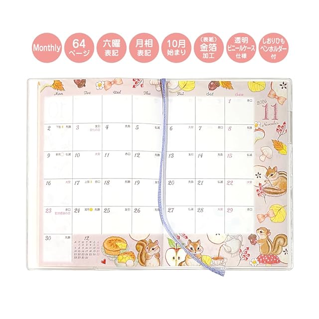 【その他】A6サイズ64ページですのでカバンの中でもかさばらず、持ち運びにも便利。表紙に金箔加工六曜月相表記透明ビニールケースにはペンホルダーが付いています。2025年10月からご使用できます。年間カレンダー、年間スケジュール、メモ今年の目標/毎月の目標、欲しいもの&行きたいところメモ、パーソナルデータ、しおりひも、ペンホルダー付