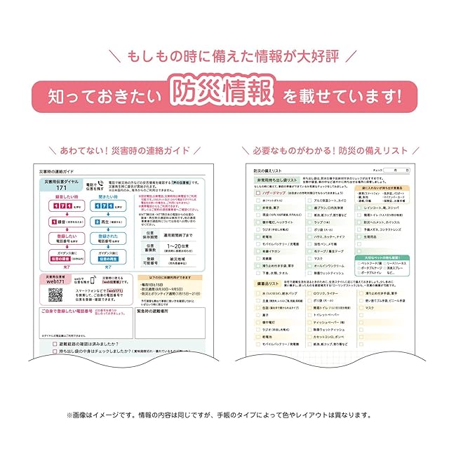 【コンテンツ】年間カレンダー、年間計画表、メモ、アドレスにもなるメモ、パスワード番号リスト、お金の管理メモ、年齢早見表、テレフォンガイド、災害時の連絡ガイド/緊急時の連絡先メモ、防災の備えリスト、チェックリスト