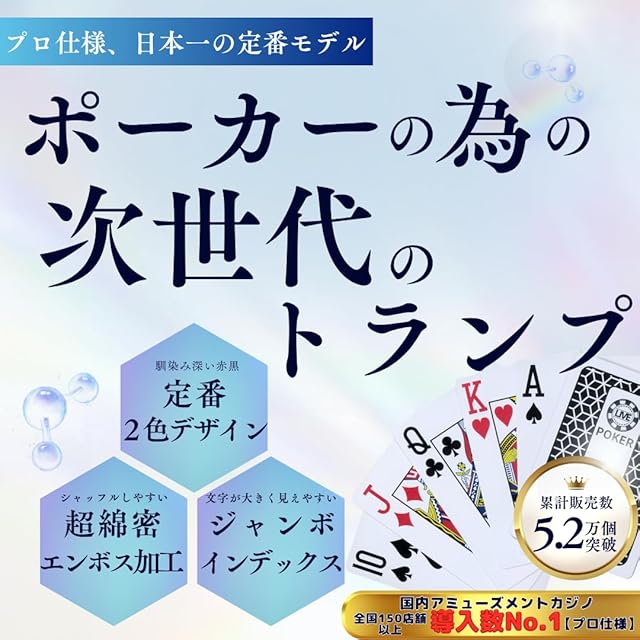 ・ポーカー専用トランプ ・カットカード付き ・2色スート ・ジャンボインデックス ・超精密エンボス加工 ・防水、防汚加工 ・背面7色展開 ・自動シャッフラー対応可 ・業界最安値