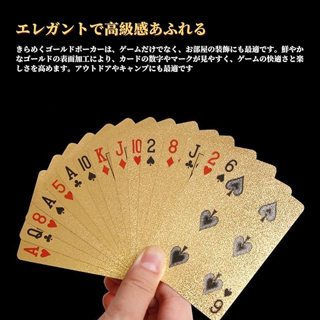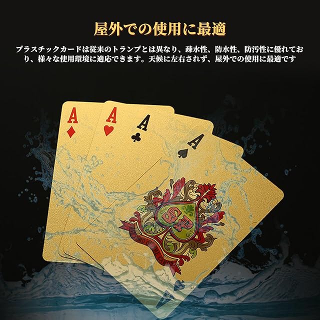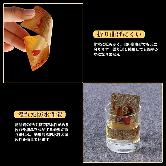 商品名:ポクミル トランプ プラスチック 2点セット 54枚 カードゲーム マジックトランプ ポーカーカード パーティー 防水 ゴールドホイル カッコイイ 金 ゴージャス 輝く 色褪せない 折れにくい 耐久