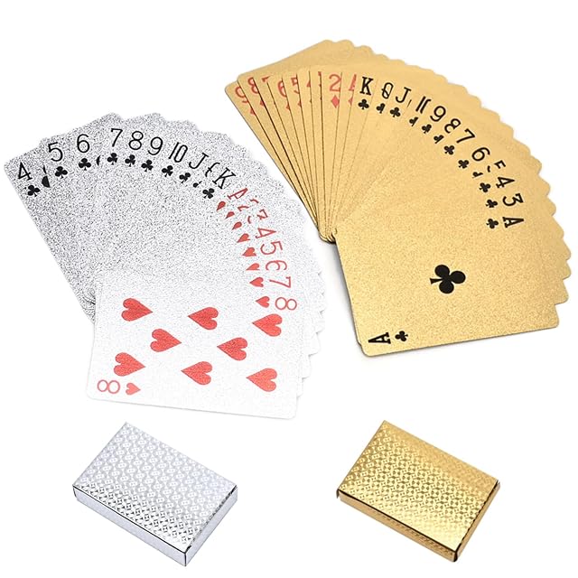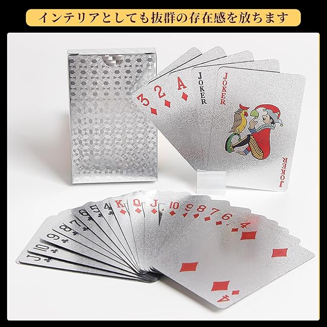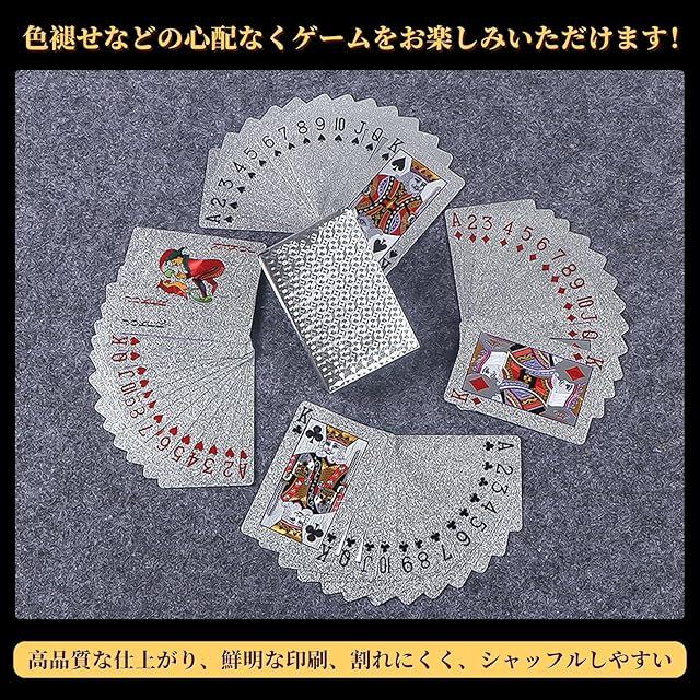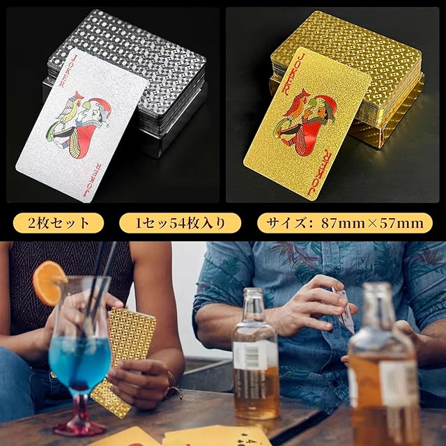 ✨【豪華な2色セット】金+銀の2枚セット、54枚1セットです。87mm×57mmの標準サイズを採用しています。普通のトランプとは異なり、金箔と銀箔を施した豪華な正方形の模様が特徴で、パーティーをより華やかに彩ります。