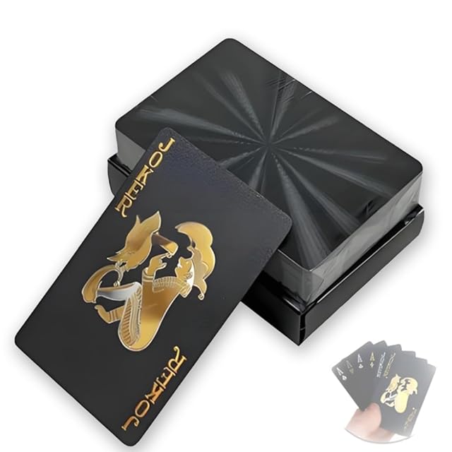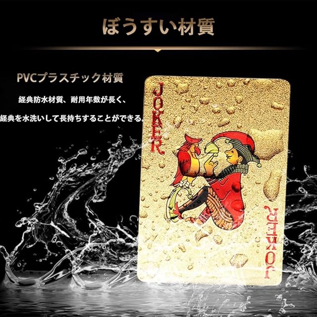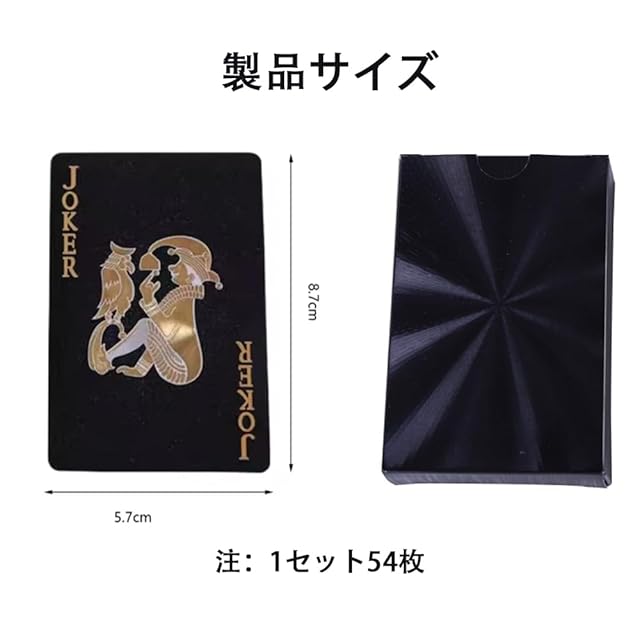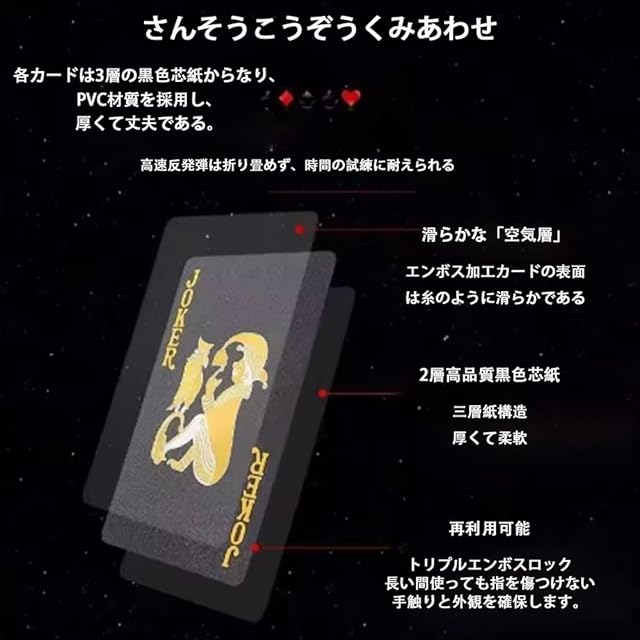 1 [高品質なプラスチックカード素材]本商品は耐久性に優れたPETプラスチック製トランプで、ゴールドの光沢と立体的な凹凸加工により、まるでダイヤモンドのような輝きを放ちます。おしゃれで個性的なデザインは、友達ゲームやパーティー、ギフトにも最適です。 2 [優れた耐久性と形状保持性]このトランプは折り曲げに強く、使用後も元の形にしっかりと戻る特性を持っています。ひっかき傷や色あせが起こりにくく、長く美しい状態で使用できます。 3 [完全防水・屋外にも最適]紙製とは異なり、水に強いプラスチック製です。ビーチやキャンプ、アウトドアの場面でも安心して使用でき、ドブルカードゲームやジェスチャーゲームなど様々なゲームに対応できます。 4 [手洗い可能でお手入れ簡単]濡れた布やティッシュで汚れを拭き取るだけで、簡単にきれいに保てます。繰り返し使用できるため、経済的で環境にも優しい仕様です。 5 [スタンダードサイズ・ユニークなブラックデザイン]54枚(52枚+ジョーカー2枚)の標準サイズカードで、黒を基調としたレーザー調の背面デザインがスタイリッシュ。エッチなゲームやゴキブリポーカー、パズルゲームなど多彩な遊びに対応できます。