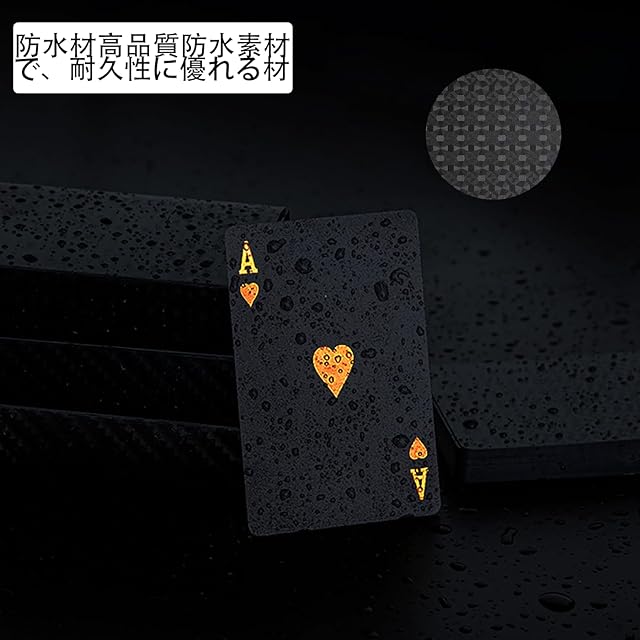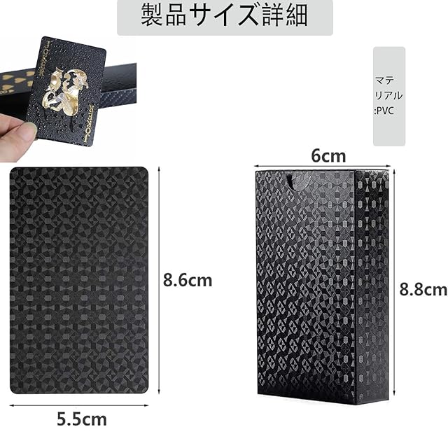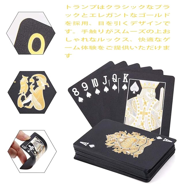 【高品質防水素材で、耐久性に優れる】このトランプは高品質のPVC素材を使用しており、優れた防水性能を備えています。従来の紙製トランプとは異なり、水洗いが可能で、汚れや濡れを心配する必要がなく、使用寿命が長く、日常の娯楽やコレクションに最適です。 <br><br><br> 【クラシックなデザインと快適な手触り】トランプはクラシックなブラックとエレガントなゴールドを採用しており、目を引くデザインです。手触りがスムーズで、外観もおしゃれで、快適なゲーム体験を提供します。家族の集まりや友人との集まりでも注目の的です。 <br><br><br> 【初心者にも優しい、柔軟で丈夫】初心者の方はプレイする時の力加減に慣れていないため、長時間練習すると通常のトランプはすぐに破れてしまいます。この製品は丈夫であるだけでなく、柔軟性があるため、長時間の練習や様々な手品を披露するのにも最適です。 <br><br><br> 【多様なシーンに対応、実用性に富む】このトランプは耐久性に優れているため、様々な場面で使用できます。家庭でのゲームやアウトドア活動、旅行先でも活躍します。また、クリスマスや誕生日のプレゼントとしても最適で、受け取った人に喜ばれること間違いなしです。 <br><br><br> 【完全包装で、配慮の行き届いた選択】各トランプセットには54枚の標準トランプが含まれており、様々なゲームニーズを満たします。美しいパッケージデザインは持ち運びが便利で、トランプを損傷から効果的に保護します。自用にも贈答用にも理想的な選択です。