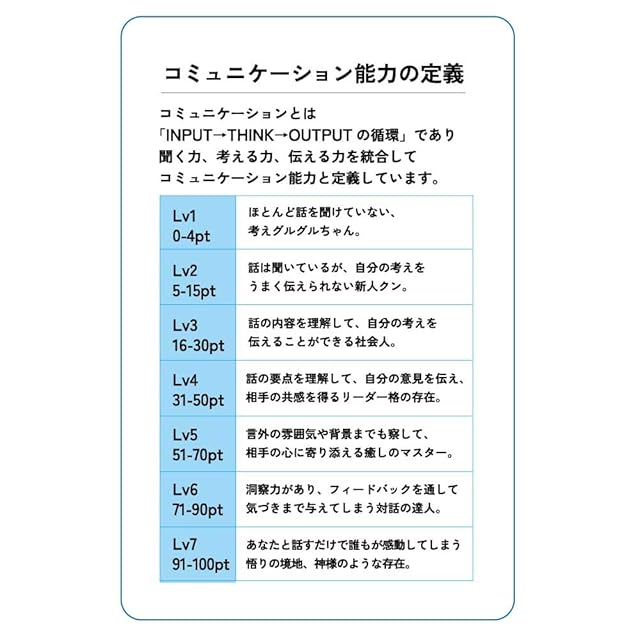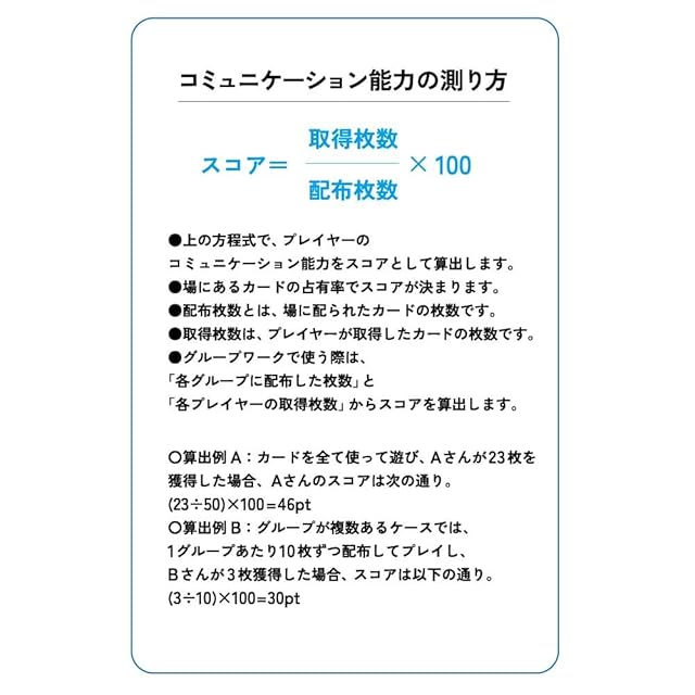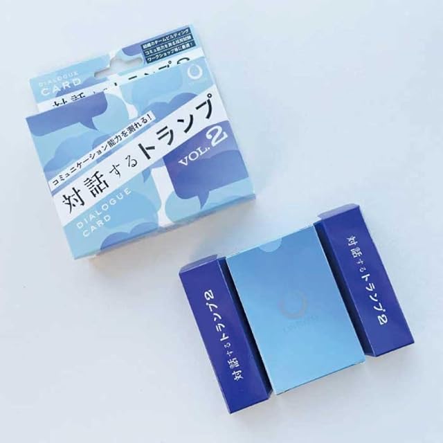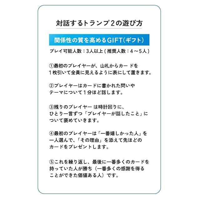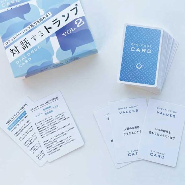 「対話するトランプ2」は、相互理解を深めるカードゲーム。お互いを褒め合うので、1時間で信頼関係が深まります。</br> コミュニケーション能力を100点満点で計測できるので、採用面接や研修・セミナー、学校の授業にも活用されています。</br> </br> <B>◆利用対象</B></br> ・学校教師</br> ・セミナー講師</br> ・企業の人事、面接官</br> ・ワークショップ等の主催者</br> ・コーチ、カウンセラー</br> ・接客業、営業職</br> </br> <B>◆利用シーン</B></br> ・学校の授業</br> ・研修、セミナー</br> ・採用面接</br> ・グループワーク</br> ・アイスブレイク</br> ・チームビルディング</br> ・顧客との雑談</br> </br> <B>◆効果・効能</B></br> ・一緒に遊んだ人と仲良くなれる</br> ・相互理解と絆が深まる</br> ・遊んだ人の自己肯定感が高まる</br> ・顧客満足度が高まる</br> ・講師としての評価が上がる</br> ・チームの雰囲気が改善する</br> ・顧客との信頼関係を築ける</br> ・コミュニケーション能力を測れる</br> </br> <B>◆遊び方</B></br> ・プレイ人数:3~5人/班</br> ・最初のプレイヤーが、山札からカードを1枚引いて全員に見えるように表にして置きます。</br> ・プレイヤーはカードに書かれた問いやテーマについて1分ほど話します。</br> ・残りのプレイヤーは時計回りに、ひとり30秒ずつ「プレイヤーが話したこと」について褒めていきます。</br> ・最初のプレイヤーは「一番嬉しかった人」を一人選び、「その理由」を添えて先ほどのカードをプレゼントします。</br> ・これを繰り返し、最後に一番多くのカードを持っていた人が勝ち(一番多くの感謝を得ることができた価値ある人)です。</br> </br> ※20人以上のグループワークでの使い方は説明書に記載</br> ※コミュニケーション能力を、7段階(レベル1~7)で測れます。</br> </br> <B>◆カードの内容(7ジャンル×各7枚)</B></br> 感情、人間性、現在、未来、可能性、本質、価値観について尋ねる「問い」が、各ジャンルごとに7枚ずつあります。</br> </br> ジャンルと「問い」の例</br> 感情 「これまでに一番、嬉しかったこと」、「疲れたときの回復方法」</br> 人間性 「パートナーに期待すること」、「自分はどういう人間だと思いますか?」</br> 現在 「最近、気になるニュース」、「休日の過ごし方」</br> 未来 「10年後はどうなっていると思いますか?」、「1ヶ月の休みがあったらしたいこと」</br> 可能性 「もしも自分が異性だったら何をしたい?」、「1日だけ全世界の人が言うことを聞いてくれるなら?」</br> 本質 「仕事に愛は必要だと思いますか?」、「人生とは?」</br> 価値観 「なぜ組織にはルールが存在するのか?」、「不可能を可能にする方法とは?」など</br>