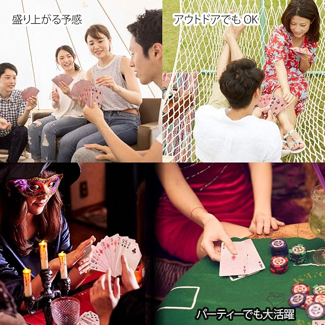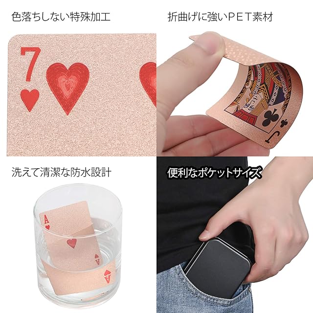♦強度と防水性が高いPET素材を採用しており破れず水に強いため「トランプに付いた汚れやウイルスも一緒に水洗いできる」ことが特徴です。
